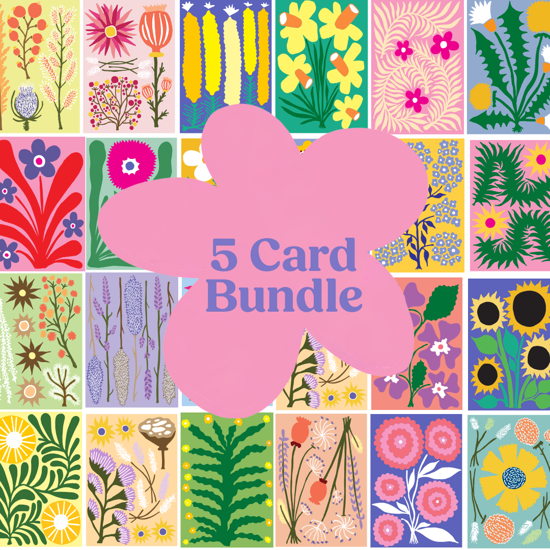 A curated bundle of five blank greeting cards, selected at random from a growing collection of over 20 unique designs. These versatile cards are perfect to have on hand for birthdays, thank yous, congratulations—or simply to say hello.